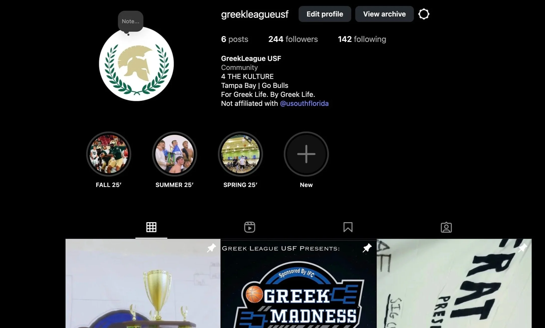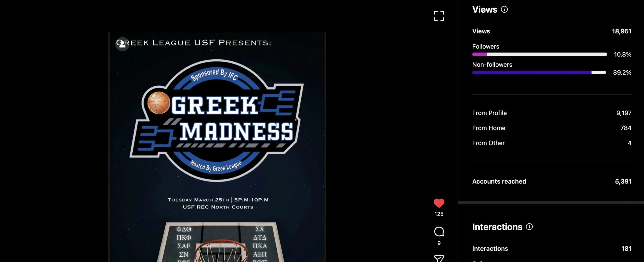 GreekLeagueUSF was created to give Greek life at USF—where it isn’t prioritized—a centralized platform that showcases (upcoming) events, and culture with content people actually want to share and events they want to attend, and participate in. It turns scattered attention into consistent engagement and visibility, driving awareness across chapters and campus-wide events without paid ads. It also serves as the brainchild for LocalVision’s framework: community-rooted content + targeted outreach → measurable reach, interactions, and real conversions.